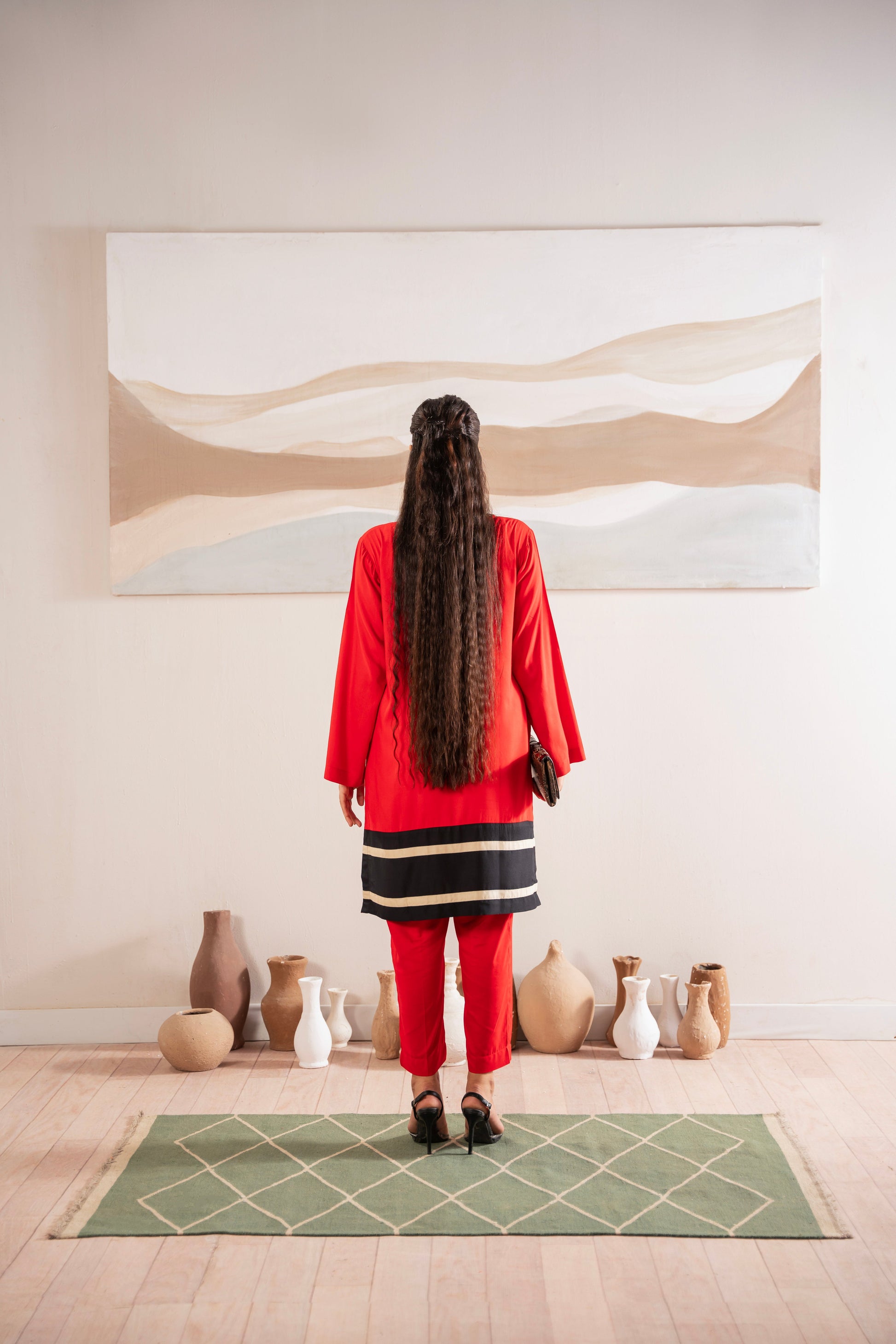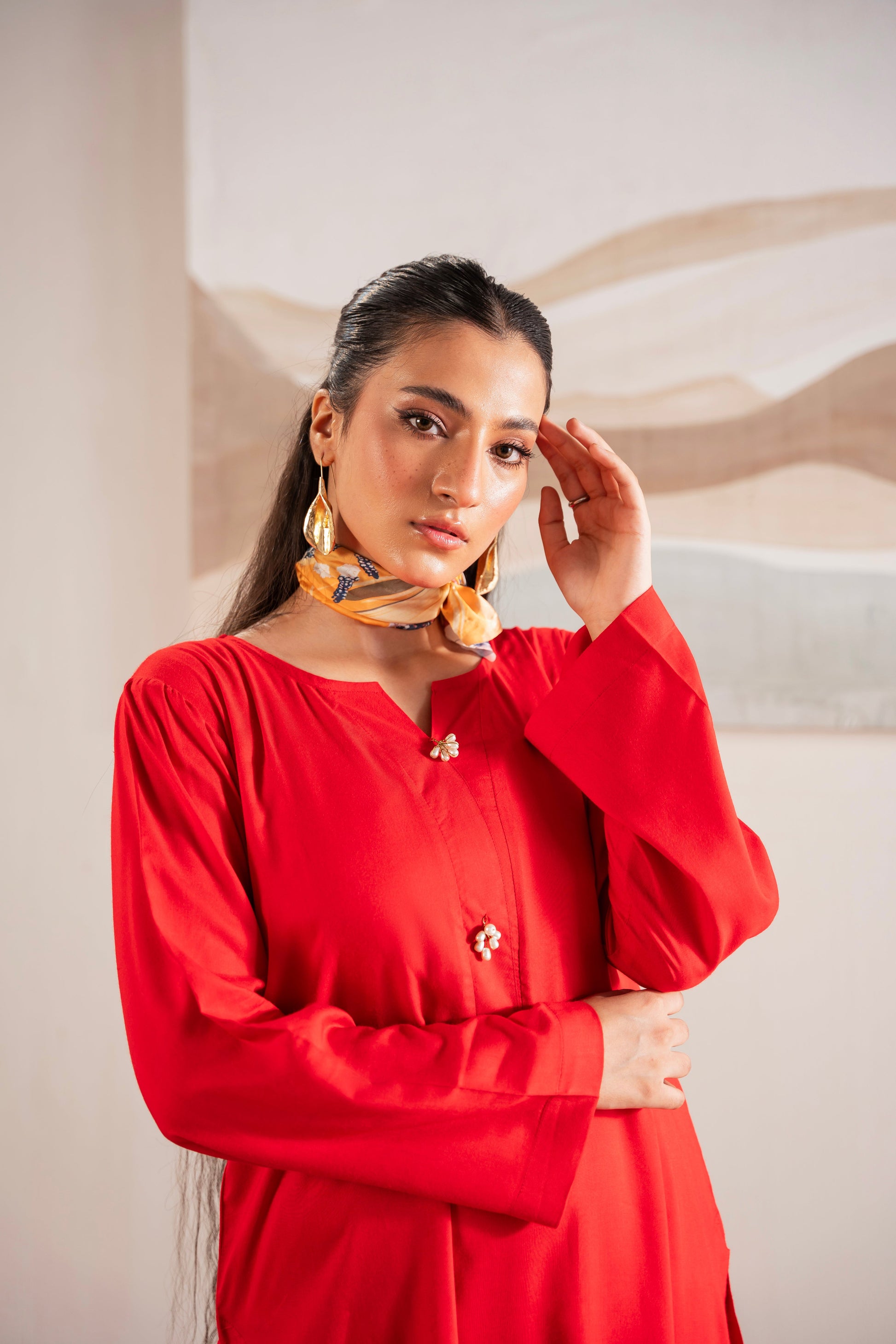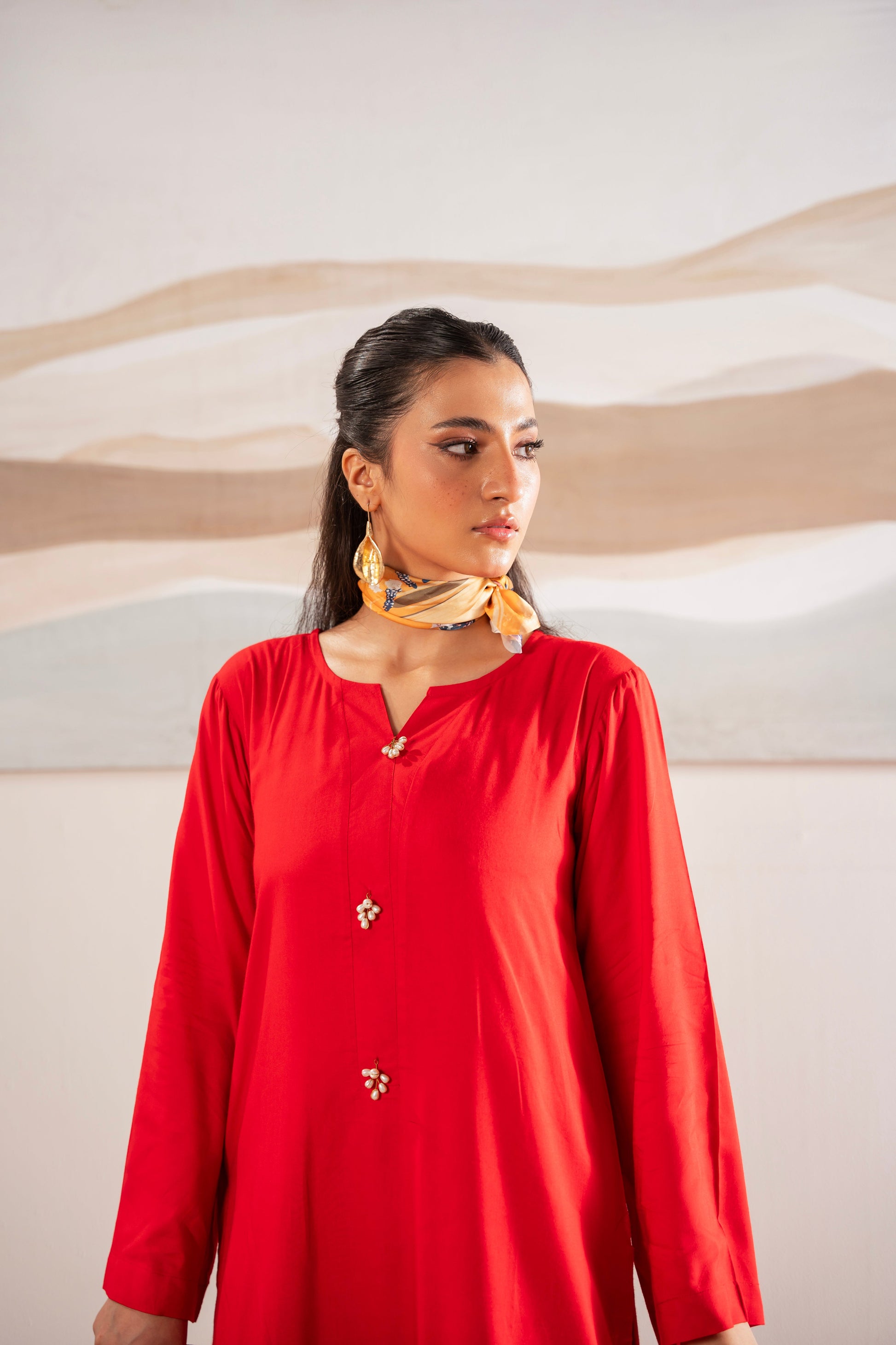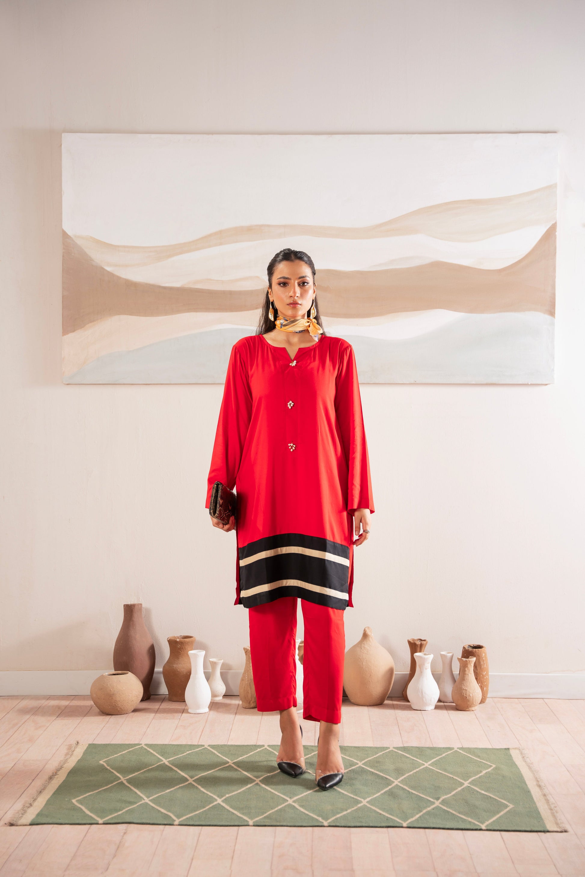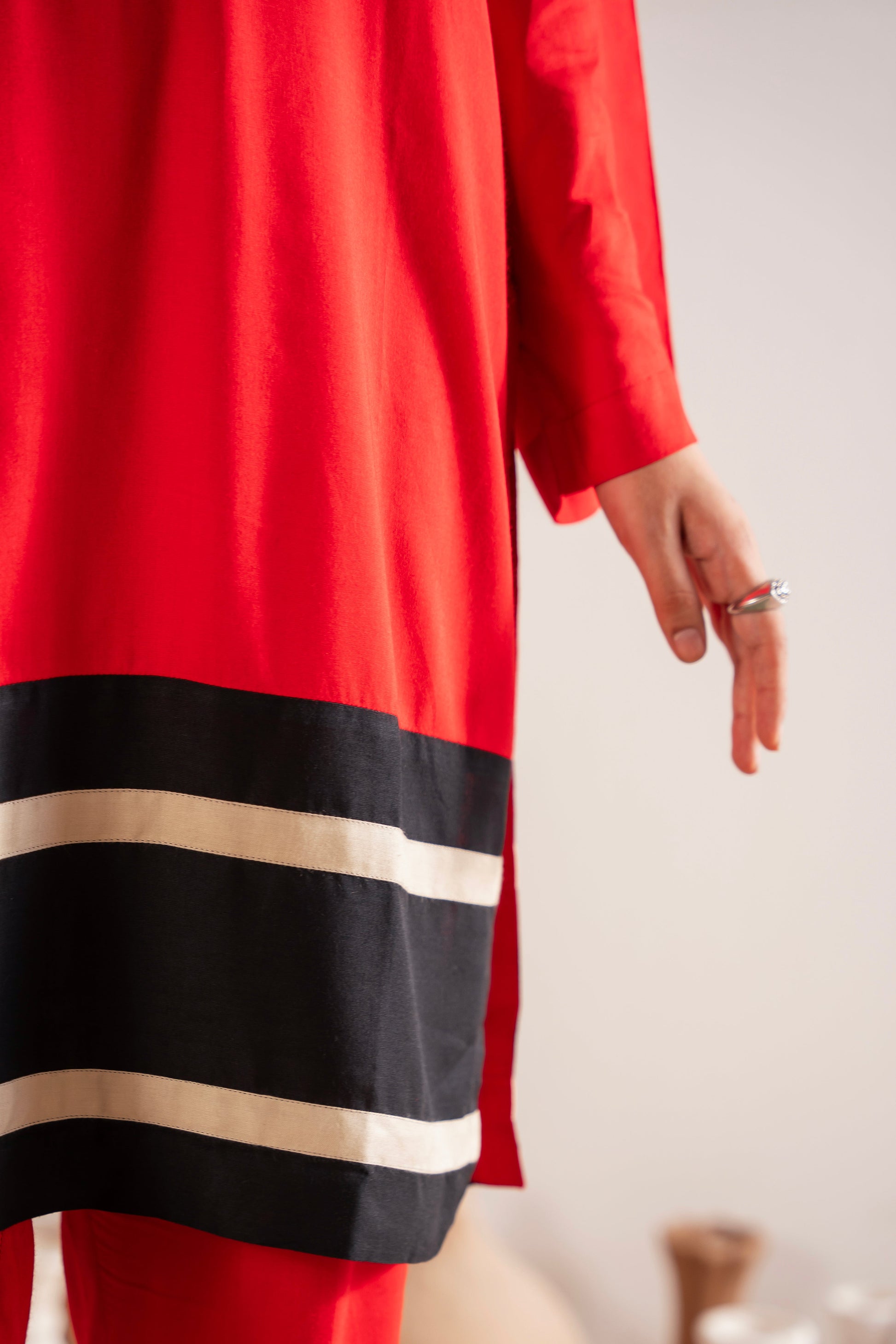 This two-piece dress includes a stylish shirt and tailored trouser. This dress is crafted from our new soft crepe fabric, known for its sweat-absorbing properties, ensuring comfort throughout the day. Designed to blend contemporary Western styles with subtle traditional touches. The dress is shown here in size small, perfectly fitted on the model. Length of Shirt, Sleeve Opening & Shirttail are as per Design. Actual color may vary slightly from what appears on your screen due to lighting.